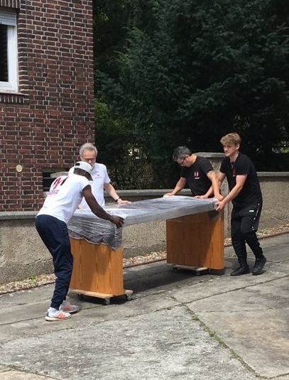 Wir träumen ja schon seit Entdeckung der Villa Würde davon, das Nebengebäude, eine ehemalige Werkstatt, aus- und umzubauen, um dort Lesungen, Konzerte, Friedensgebete, Gottesdienste anbieten zu können. Im Augenblick fehlen die nötigen Mittel dafür. Doch zeigt diese Lieferung, dass wir einen großen Gott haben, der ganz andere Mittel und Wege hat. Und war es nicht auch unter Nehemia so, dass Esra bereits den Altar aufgerichtet hatte, noch bevor der Tempel errichtet war?